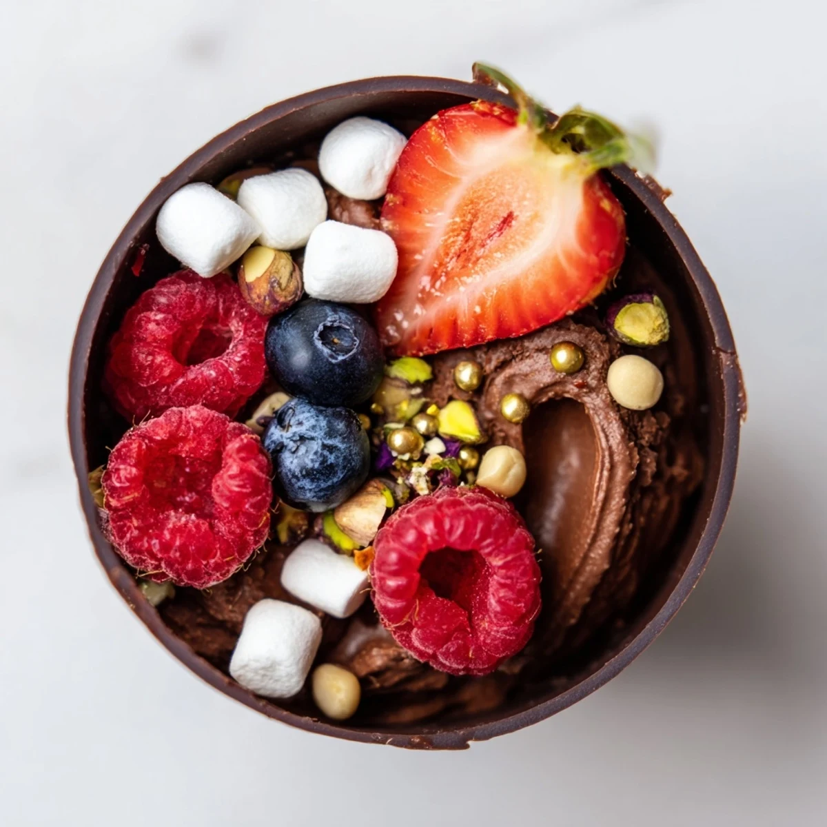 - Pipe or spoon the mousse into each chocolate cup, leaving enough room for your gorgeous toppings to shine. Arrange the berries, nuts, marshmallows, and chocolate curls like tiny edible works of art, finishing with gold leaf if you're feeling fancy.