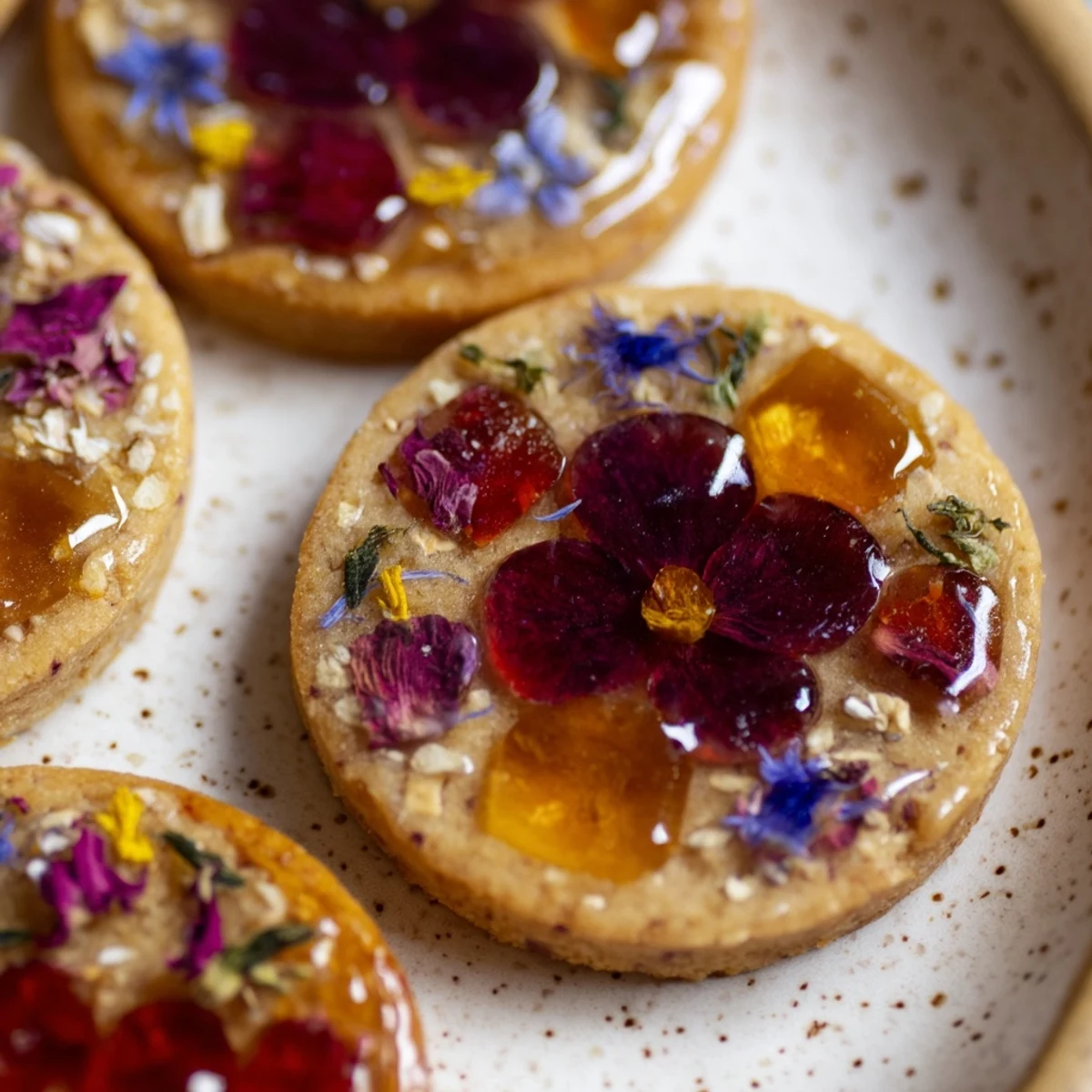 These elegant treats combine the aromatic sophistication of Earl Grey tea with a mesmerizing stained glass effect created by melted vegan candies. The cookie dough achieves perfect balance through the addition of almond flour and maple sweetness, while edible flowers like rose petals, cornflower, and lavender create an enchanting visual appeal. Perfect for afternoon tea gatherings, wedding favors, or whenever you want to serve something truly memorable.