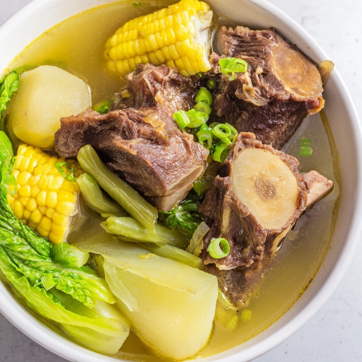 This hearty Filipino soup combines fork-tender beef shank and gelatinous bone marrow with sweet corn, baby potatoes, carrots, green beans, and napa cabbage. The clear broth gets its depth from hours of simmering with aromatics like onions and whole peppercorns, finished with fish sauce for that authentic umami punch. Perfect for cool weather dining, this dish brings family together around the steaming pot. Squeeze fresh calamansi over each bowl for brightness, and don't forget to scoop out that precious marrow—it's the best part!