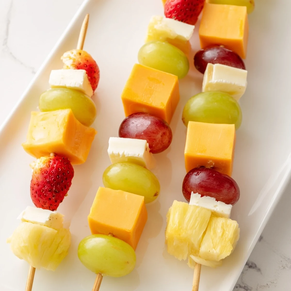 - Create patterns that look gorgeous—maybe start with a grape, then strawberry, cheese cube, pineapple, and repeat until each skewer has about six to eight pieces. Leave a little space at both ends so people can pick them up without touching the food.