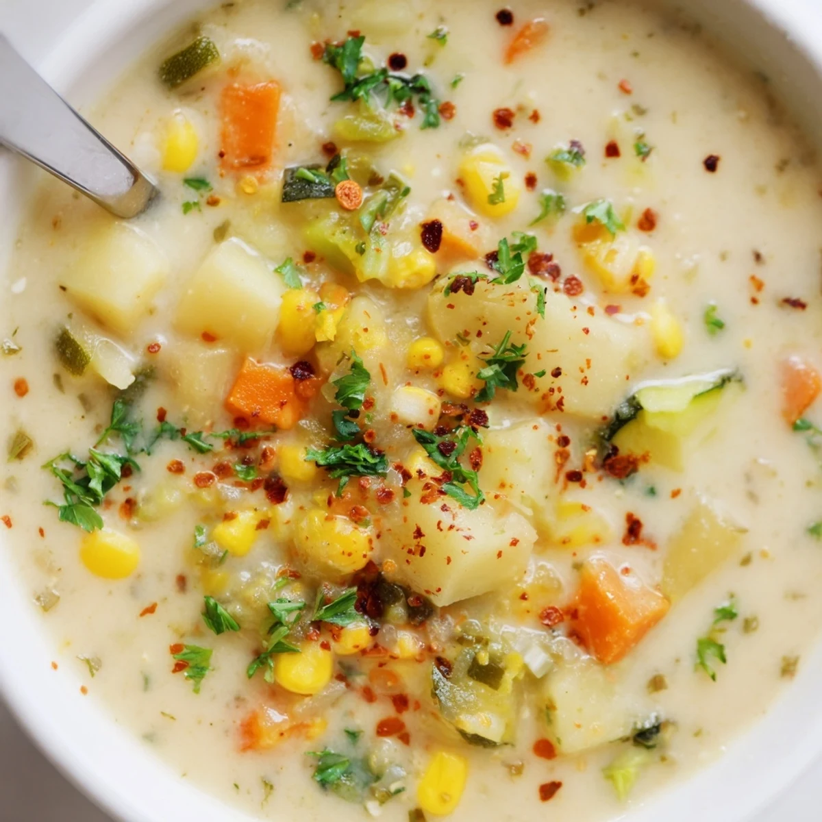 This satisfyingly creamy soup combines tender potatoes, sweet corn, and fresh zucchini in a rich, flavorful broth. The chunky texture and blend of vegetables create a nourishing bowl that's perfect for chilly evenings. Ready in just 45 minutes with simple ingredients and easy preparation. Partial blending gives you the best of both worlds—creamy consistency with hearty vegetable chunks throughout.