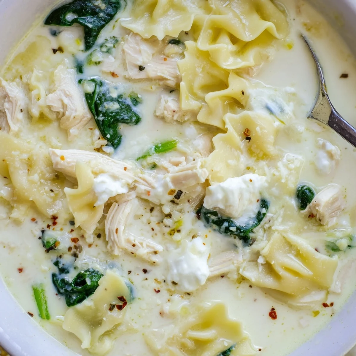 This comforting white lasagna soup transforms all the flavors of classic lasagna into a quick, spoonable meal. Broken lasagna noodles cook directly in the broth, absorbing the savory flavors of chicken, garlic, and Italian herbs. The creamy base comes from a blend of whole milk and heavy cream, while ricotta, mozzarella, and Parmesan create that signature cheesy lasagna experience. Tender shredded chicken and fresh baby spinach add protein and nutrients, making each bowl satisfying and complete.