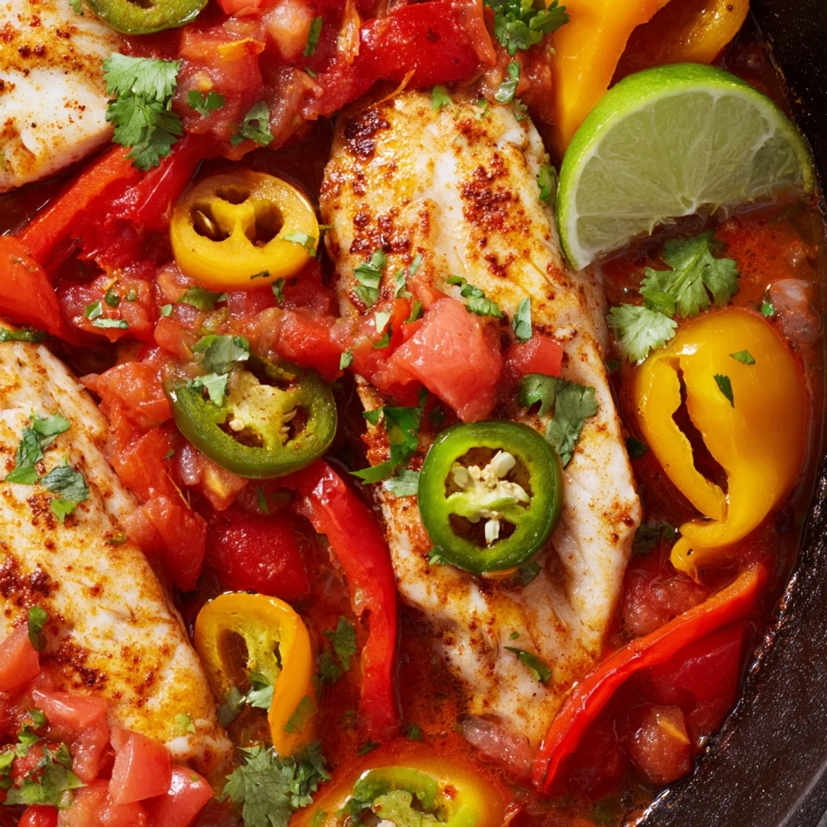 This skillet dish features tender tilapia fillets nestled among a medley of roasted red and yellow peppers, jalapeño slices, and aromatic tomatoes seasoned with smoked paprika and cumin. The fish simmers gently in the spicy pepper sauce, absorbing all those bold southwestern flavors. Finished with fresh lime juice and cilantro, each bite delivers a perfect balance of heat and brightness. The entire dish comes together in just over half an hour, making it ideal for weeknight dinners when you want something impressive yet effortless.
