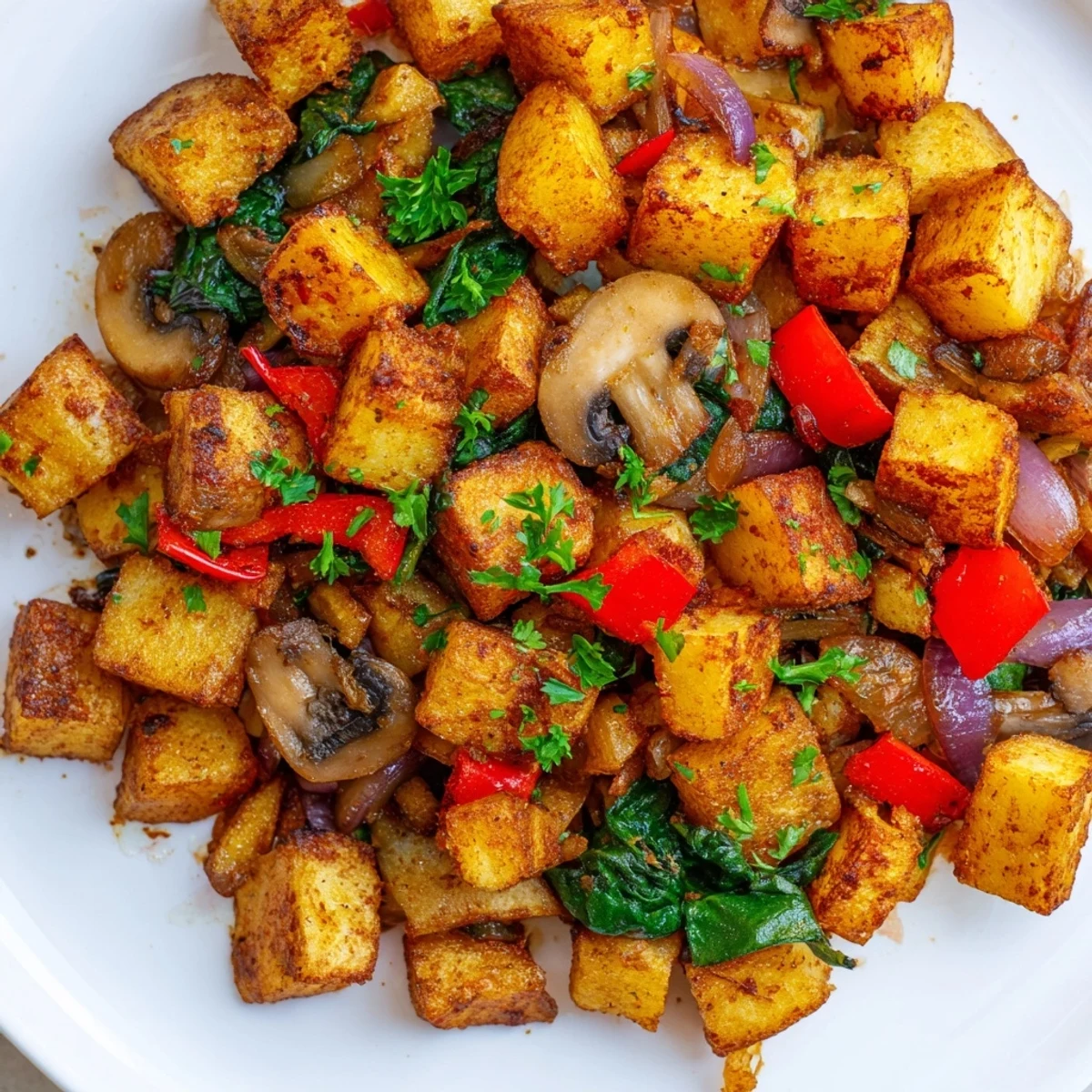 This satisfying vegan hash features golden crispy potatoes combined with colorful bell peppers, earthy mushrooms, and fresh spinach.